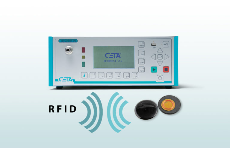 Il CETATEST 515 viene utilizzato con successo per il test di tenuta in linea dei transponder RFID. Il transponder rotondo ha un diametro di 30 mm e uno spessore di 6 mm. Dovrebbe essere impermeabile a una pressione di 200 mbar. Per la tenuta all'acqua è possibile utilizzare un tasso di perdita d'aria di 0,01 mbar * l / s (corrispondente a 0,6 cm³ / min), comunemente utilizzato nell'industria. Il volume esterno del transponder è di 4,24 cm³. La cappa di prova quasi contorno (0,5 mm di spazio d'aria intorno alla parte di prova) ha un volume vuoto di 5,28 cm³. In questo modo è possibile la chiara identificazione delle parti di prova di perdita grossolana, dove in caso di perdita grossolana viene riempito il volume interno di soli 0,31 cm³.