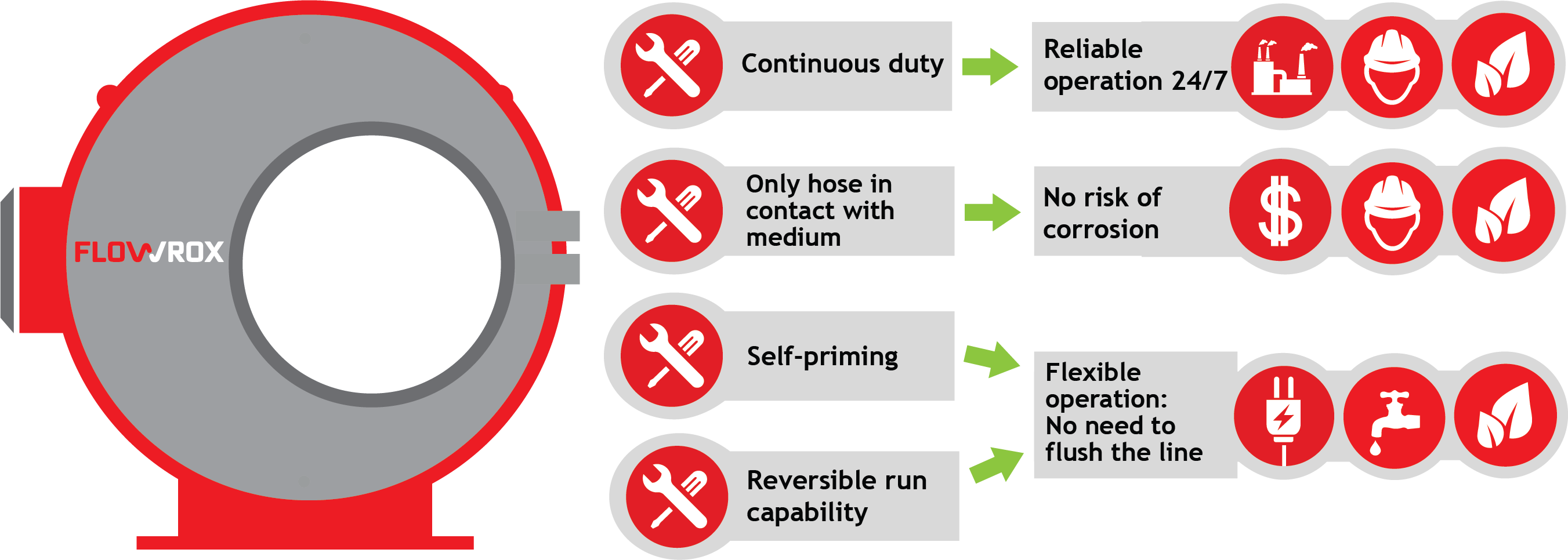 El diseño rodante dela bomba de manguera Flowrox tamamicans no permit conacia adelante y hacia atrás。El autocebado (estándar en todas las bombas de manguera Flowrox)不允许使用以下材料:línea en todas as camada ciclo de filtración y eliminar El riesgo de obstrucción en las tuberías debido a la sedimentación del material。“可怜的人,没有必要在系统中添加额外的资源,”babb