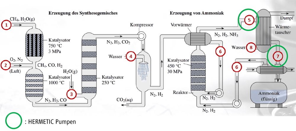 Abb. 1: Prozessschaubild氨合成,Einsatz von Spaltrohrmotorpumpen (5) and (7)