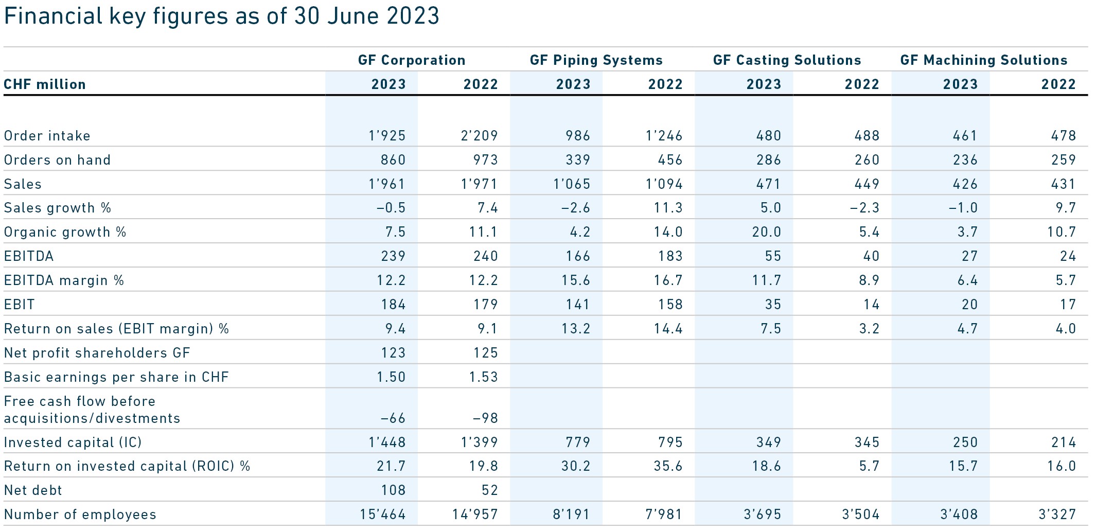 The operating result (EBIT) rose to CHF 184 million, with a corresponding EBIT margin of 9.4%. In the first half of 2022, these were CHF 179 million and 9.1%, respectively. Net profit attributable to GF shareholders amounted to CHF 123 million, compared with CHF 125 million in the first half of 2022. Free cash flow came in at minus CHF 131 million (2022: minus CHF 37 million). Before acquisitions/divestments, the free cash flow was minus CHF 66 million (2022: minus CHF 98 million).