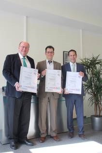 Bild: Die Geschäftsleitung der Netzsch Pumpen & Systeme GmbH Dipl. Wirtsch.-Ing. Felix Kleinert und Dipl. Kfm. Jens Niessner freuen sich mit Dipl. Ing. Bert Nowitzki, Leiter Integrierte Qualitätssysteme, über die Zertifizierung nach DIN EN ISO 14001, OHSAS 18001 und DIN EN ISO 9001. Von links nach rechts: Felix Kleinert, Bert Nowitzki, Jens Niessner.