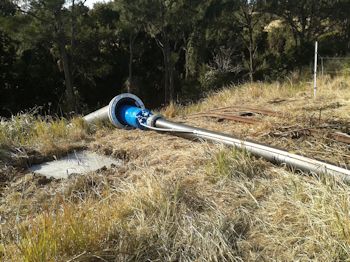 泵房,Nambour当地的澳大利亚泵经销商提出了一个“开箱即用”的解决方案。一台Tsurumi LH619潜水脱水泵安装在一个630毫米的PN10多管套内,现在可以将水输送到75kW的灌溉泵。聚合物套筒沿着河岸向下延伸,由电缆和锚链固定。