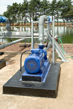 Bild: Aus dem Speicherbecken, in dem sich das Wasser erwärmt, fördern die Etanorm-Pumpen während der Saison das begehrte Medium zum Beregnen. (Foto: KSB)