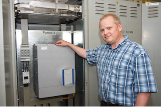 Bild: Das Pumpensystem mit dem Regelsystem PumpDrive bedienen die Barlebener Betreiber komfortabel vom Schaltschrank aus, erläutert Oliver Enßlen, Kundenbetreuer im Auftrag von KSB. (Foto: KSB)