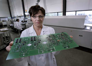 Bild: Vor allem Komponenten für Hocheffizienzpumpen wie die abgebildete Leiterplatte für Pumpen der Baureihen „Wilo-Stratos“ sollen an der neuen Fertigungslinie entstehen. Nach dem Auftragen der Lötpaste mittels Siebdruckverfahren werden die Leiterkarten doppelseitig mit ca. 1.000 Bauteilen bestückt.